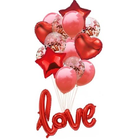 Buchet de 15 Baloane LOVE, Balon Folie, Latex 12 inchi, Latex Transparent cu Confetti, Plus Rabant, Culoare Rosu