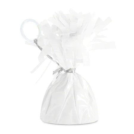 Greutate din folie metalizata pentru baloanele cu heliu,culoare alb, It’s Party Time, 156 g Greutatea este destinata pentru a tine baloanele umplute cu heliu aproape de sol prin simpla legare a baloanelor de greutate. Caracteristici: – greutate pentru baloane cu heliu; – confectionata din metal, invelita in folie colorata; – diametru 5,5 cm; – inaltime 13 cm; – culoare alb.