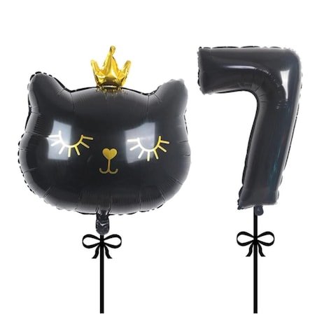 Set 2 baloane folie, It’s Party Time, cap pisicuta negru, balon folie cifra 7, negru 1M