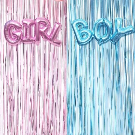 Set 2 bucati de Perdea Decorativa, din Folie Albastru / Roz Metalizat pentru Petreceri Aniversare si Doua Baloane cu Boy si Girl potrivit pentru Gender Reveal, Baby Shower