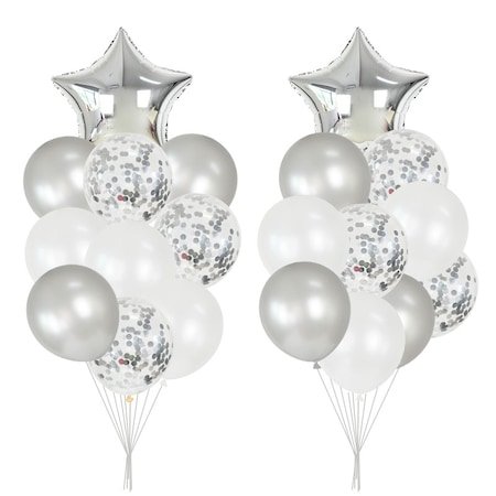 Set 20 Baloane Aniversare, Argintiu, It’s Party Time Setul contine: – 2 baloane din folie in forma de stea, culoare argintiu, dimensiune 45 cm; – 6 baloane din latex, culoare argintiu, 30 cm; – 6 baloane din latex, culoare alb, 30 cm; – 6 baloane din latex transparent cu confetti argintiu in interior, 30 cm. * Baloanele se livreaza neumflate. * Pot fi umflate atat cu aer cat si cu heliu. Baloanele din folie umflate cu heliu se mentin intre 5 – 10 zile, in functie de dimensiunea si forma lor. Cu aer pot sa se mentina umflate chiar si mai multe luni. Baloanele din latex umflate cu heliu se mentin in general intre 6 – 8 ore Baloanele din latex sunt biodegradabile, fiind prietenoase cu mediul inconjurator. In functie de setarile fiecarui monitor sau producator, culorile pot sa difere de cele afisate. * Este recomandat ca baloanele sa fie ferite de soare, aer conditionat, ger etc pentru ca se pot sparge sau se pot dezumfla mai repede.