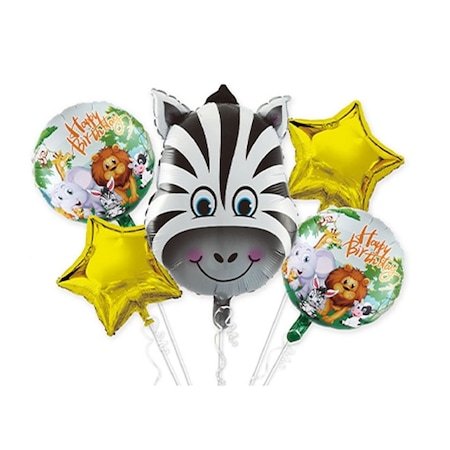 Set 5 baloane folie Zebra, It’s Party Time, 60cm Setul contine: • 1 balon din folie, figurina zebra, de dimensiuni: 60 cm; • 2 baloane din folie, forma stea, de dimensiuni 45 cm. • 2 baloane rotunde din folie, print animale, Happy Birthday, de 45 cm. **Setul contine pai pentru umflarea cu usurinta a baloanelor si rabant (rola de legat baloanele 5 metri). *Baloanele se livreaza neumflate * Nuantele de culoare reale ale produselor pot fi usor diferite fata de imaginile vizualizate pe ecranele digitale *Va rugam sa umflati cu atentie baloanele si sa evitati umflarea excesiva pentru a preveni spargerea acestora. Baloanele din folie umflate cu heliu se mentin intre 5 – 10 zile, in functie de dimensiunea si forma lor. Cu aer pot sa se mentina umflate chiar si mai multe luni. Baloanele din latex umflate cu heliu se mentin in general intre 6 – 12 ore Baloanele din latex sunt biodegradabile, fiind prietenoase cu mediul inconjurator. * Este recomandat ca baloanele sa fie ferite de soare, aer conditionat, ger etc pentru ca se pot sparge sau se pot desumfla mai repede. Se umfla usor cu ajutorul paiului din pachet sau cu ajutorul unei pompe manuale, iar pentru a crea un decor ca cel din imagini se pot umfla si cu heliu