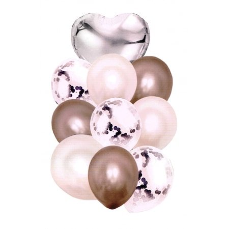Un set senzational de baloane. Un element obligatoriu al oricarei parti. Culoare argintie. Setul include: 1 buc inima folie 46 cm, 3 buc latex transparent cu confetti argintii, 3 buc latex alb 30 cm, 3 buc latex argintiu 30 cm, 1 buc panglica.