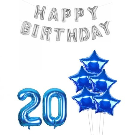 Set Baloane Aniversare 20 Ani Caracteristici: – 1 balon din folie cifra 2, 81×50 cm, culoare albastru; – 1 balon din folie cifra 0, 81×50 cm, culoare albastru; – 5 baloane din folie in forma de stea, 45 cm, culoare albastru; – 13 baloane din folie in forma de litere Happy Birthday, dimensiune 40 cm, culoare argintiu. Literele se pot umfla doar cu aer; * Baloanele se livreaza neumflate. * Pot fi umflate atat cu aer cat si cu heliu. Baloanele din folie umflate cu heliu se mentin intre 5 – 10 zile, in functie de dimensiunea si forma lor. Cu aer pot sa se mentina umflate chiar si mai multe luni. In functie de setarile fiecarui monitor sau producator, culorile pot sa difere de cele afisate. * Este recomandat ca baloanele sa fie ferite de soare, aer conditionat, ger etc pentru ca se pot sparge sau se pot dezumfla mai repede.