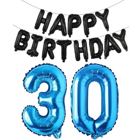 Set Baloane Aniversare Happy Birthday 30 Ani, Cifre Folie Negru / Albastru, It’s Party Time