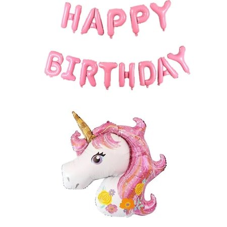 Set baloane folie Happy Birthday, 40 cm + balon folie Unicorn Rose Gigant, 110 cm, It’s Party Time